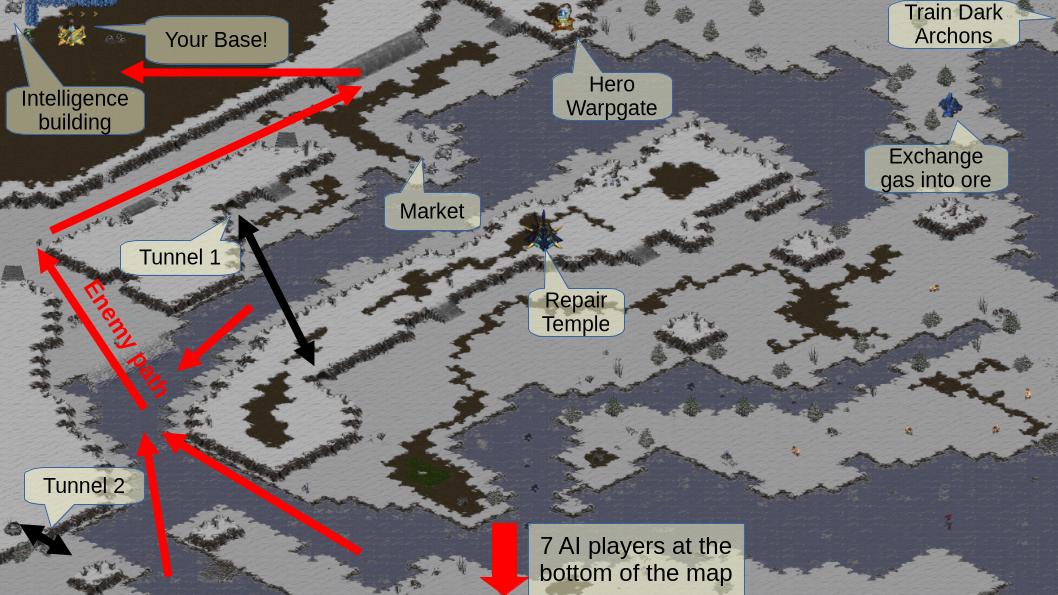 Your position is perfect for defense and further away from the AI players, giving you a little more time before the trouble starts. You have some additional buildings that 1) show you the area around your base, 2) allow you to upgrade units to hero versions, 3) sell units for half the construction cost, 4) exchange gas for ore 5) convert Overlords into Dark Archons, and 6) repair some of your damaged Protoss units (see image below). Raszagal will appear after 3 minutes and show you the important locations. At the end of the tutorial, you will be asked whether the AI should be allowed to cheat with resources (as designed by Blizzard) or whether the ore supply should be regularly reset to zero via a trigger as soon as all mineral deposits of this player have been exhausted.